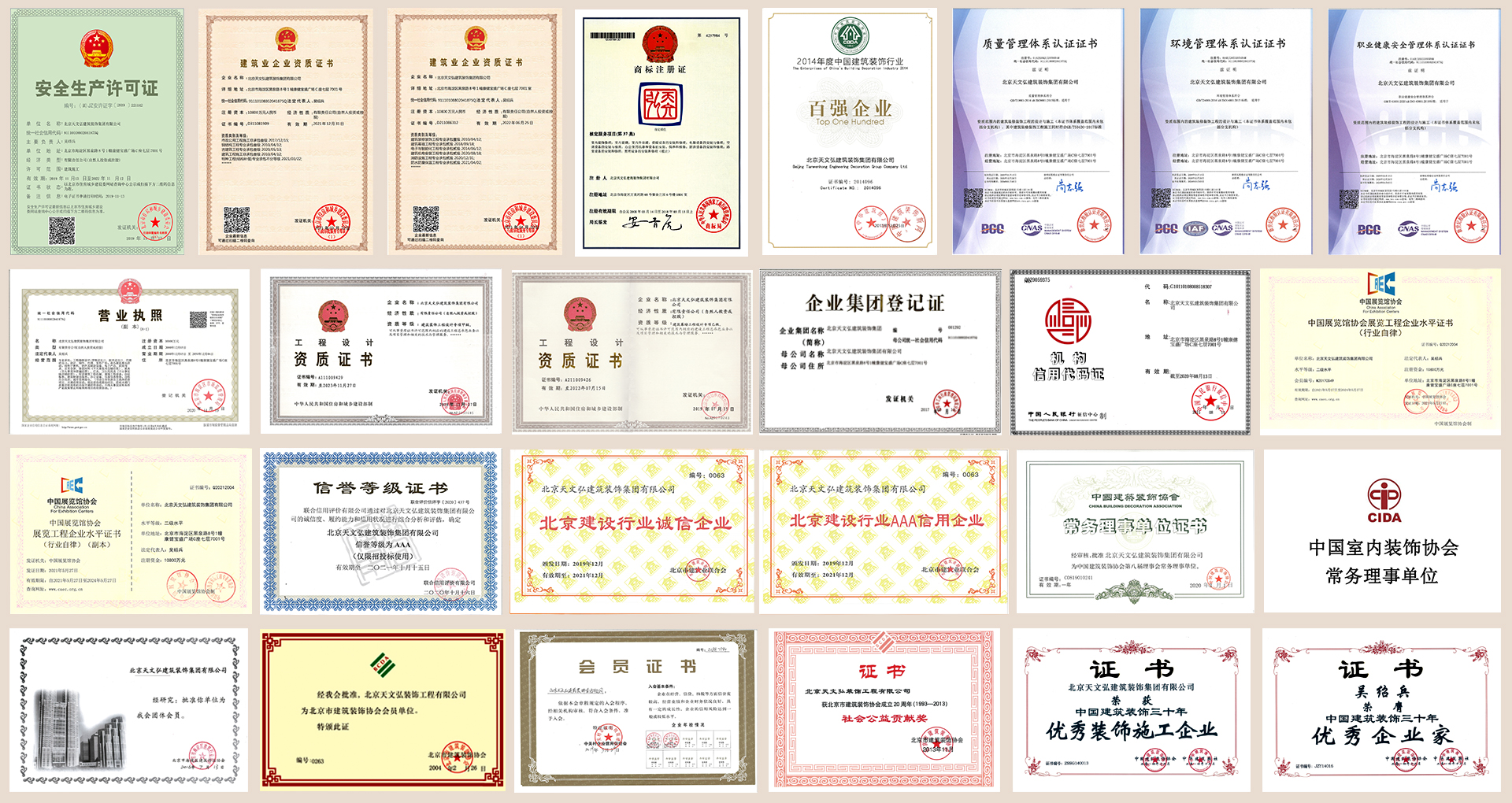 北京天文弘建筑裝飾集團(tuán)有限公司,始創(chuàng)于1995年,正式成立于2000年,注冊(cè)資本10800萬(wàn)元,總部位于海淀區(qū)康健寶盛廣場(chǎng)。下轄八個(gè)子公司十五個(gè)分公司:北京天文弘裝飾設(shè)計(jì)院有限公司、北京弘藝豐勞務(wù)分包有限公司、北京天文弘家具有限公司、蕪湖天文弘裝飾工程有限公司、天文弘(北京)國(guó)際文化發(fā)展有限公司、北京天文弘智能家居科技有限公司、北京天文弘創(chuàng)新科技股份有限公司、北京天文弘取道酒業(yè)有限公司;安徽、合肥、新疆、上海、寧夏、海南、西安、廣東、四川、天津、江蘇、河北、北京第一、第二 、第三分公司。是建設(shè)部核準(zhǔn)的國(guó)家建筑裝飾設(shè)計(jì)甲級(jí)資質(zhì)、施工壹級(jí)資質(zhì)的企業(yè);同時(shí)具有建筑幕墻工程設(shè)計(jì)乙級(jí)、施工貳級(jí)、電子與智能化工程專業(yè)承包貳級(jí)、建筑機(jī)電安裝工程專業(yè)承包貳級(jí)、消防設(shè)施工程專業(yè)承包貳級(jí)、防水防腐保溫工程專業(yè)承包貳級(jí)、特種工程、鋼結(jié)構(gòu)、古建筑、展陳工程及建筑工程施工總承包、市政公用工程施工總承包等多項(xiàng)資質(zhì)。連續(xù)多年通過(guò)了ISO9001質(zhì)量管理體系、ISO14001環(huán)境管理體系、ISO28001職業(yè)健康安全管理體系認(rèn)證?,F(xiàn)為阿里巴巴經(jīng)濟(jì)體優(yōu)秀供應(yīng)商、融創(chuàng)·中國(guó)戰(zhàn)略合作伙伴、中國(guó)建筑裝飾協(xié)會(huì)常務(wù)理事單位、北京市建筑裝飾協(xié)會(huì)副會(huì)長(zhǎng)單位、中國(guó)建筑裝飾行業(yè)百?gòu)?qiáng)企業(yè)。是中央國(guó)家機(jī)關(guān) 2011-2022年度工程項(xiàng)目定點(diǎn)施工企業(yè)。